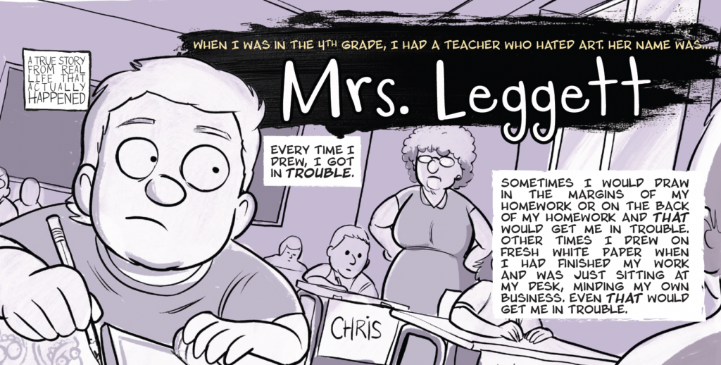 I also write and illustrate a short story in every book that is a true story from my life, like the time I sucked all the ink out of a pen during a science test, or the time I got my head stuck in a door and peed myself.