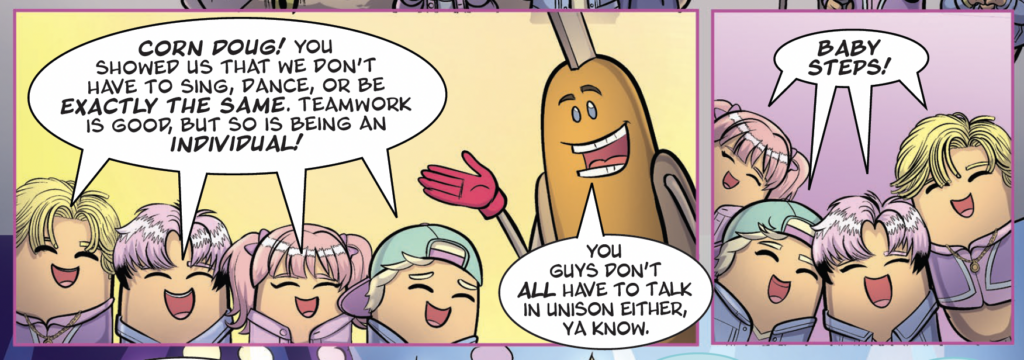 Here are some of my contributions in this book. First, Corn Doug and Diggity Dog, about a dad who eats an over-microwaved Corn Dog and becomes a super corn dog, and he has a dog who is way cooler than him. I co-created Corn Doug with Eric Branscum. Part of the fun of Corn Doug is we leave little parts of the comics unfinished and ask kids to fill those spots in, whether it’s writing in dialogue for a character, coloring, or drawing something into the panel.